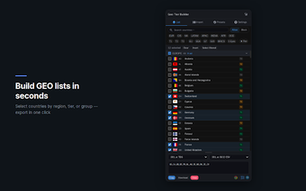 Geo Tier Builder 是一个多功能的 Chrome 扩展,旨在帮助网站管理员和媒体买家创建和管理分层国家列表以及地理定位规则。这个免费的工具支持离线功能,确保隐私和安全,同时允许用户为广告定位、TDS 规则和流量管理构建允许/阻止段。它提供了 249 个国家和 8 个地区的分类,内置分层分类和过滤选项,以简化管理复杂地理定位需求的过程。